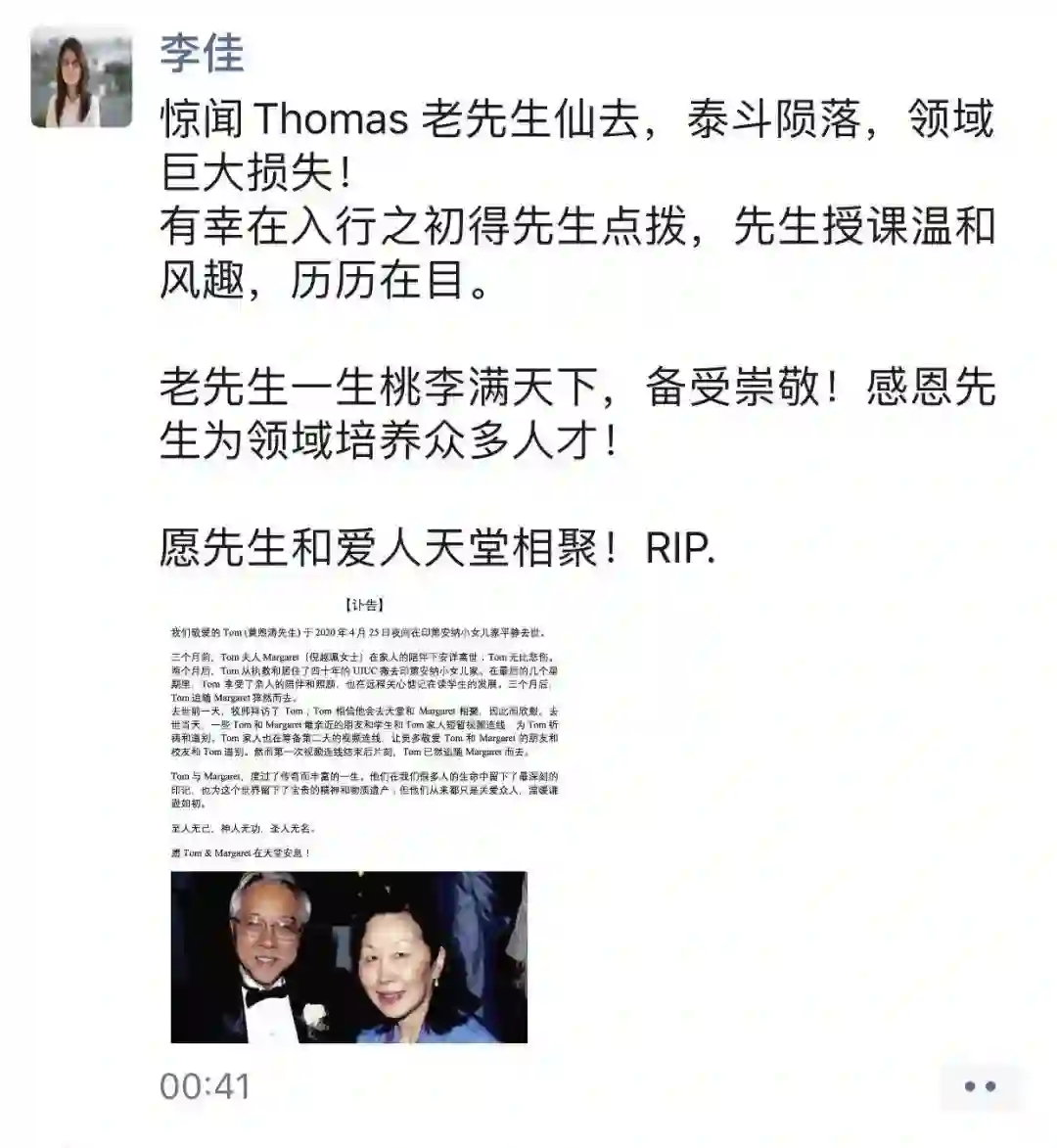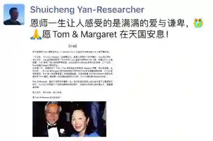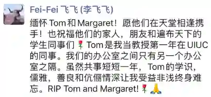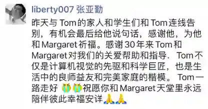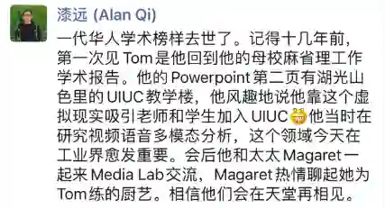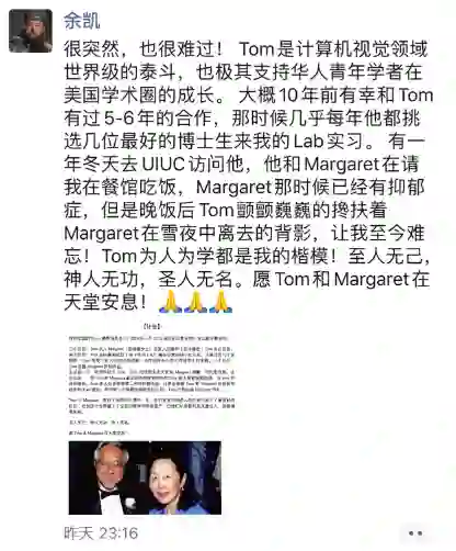联想集团首席技术官芮勇:恩师 Prof. Tom Huang 离我们而去。Tom 是计算机视觉,人工智能,多媒体泰斗,美国工程院,中国两院院士。为世界计算机界发展做出来重大贡献。不过对我们学生来说,我们更记住的是 Tom and Margaret 的为人师表,是我们一生的楷模! Tom and Margaret 做事做人令我们无法望其项背,唯有时刻鞭策自己。有幸昨天在视频里见Tom一面,但现在任然无法相信!愿Tom & Margaret 在天堂相聚!恩师Tom一路走好。我们100多学生为您祈祷。地平线创始人余凯:很突然,也很难过!Tom是计算机视觉领域世界级的泰斗,也极其支持华人青年学者在美国学术圈的成长。大概10年前有幸和Tom有过5-6年的合作,那时候几乎每年他都挑选几位最好的博士生来我的Lab实习。有一年冬天去UIUC访问他,他和Margaret在请我在餐馆吃饭,Margaret那时候已经有抑郁症,但是晚饭后Tom颤颤巍巍的搀扶着Margaret在雪夜中离去的背影,让我至今难忘!Tom为人为学都是我的楷模!至人无己,神人无功,圣人无名。愿Tom和Margaret在天堂安息!🙏🙏🙏