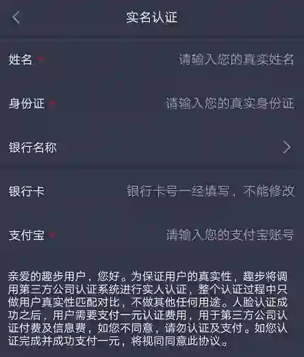 要在“趣步”实名认证,需要上传身份证号、银行卡、支付宝账号、本人照片、电话。虽然这些信息传到了一个陌生的App上面,几乎等同于在网络裸奔,但咱认了。