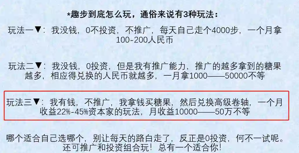 “每天正常走路,一年下来至少收入5000元,如果参与投资,一年躺赚50万。”