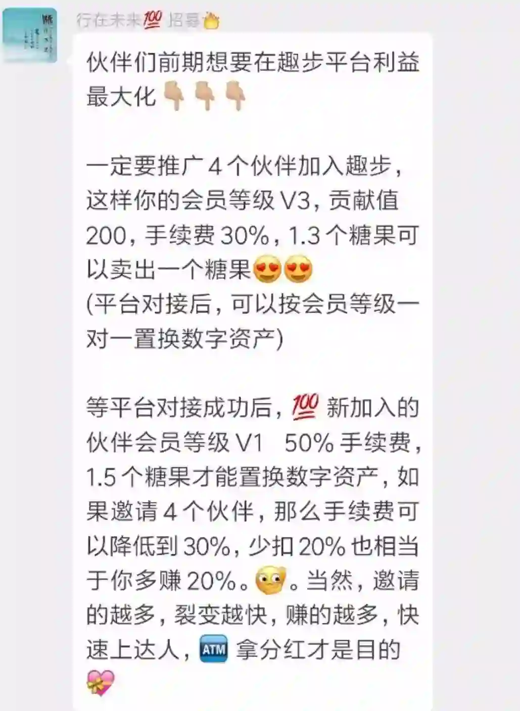 趣步因涉嫌传销、非法集资、金额诈骗等违法行为被长沙市相关单位正式立案调查,并奉劝大家不要参与趣步项目,不要对“糖果”进行炒作。