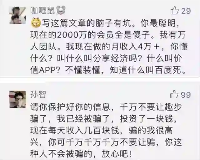 此外,随着用户的疯狂扩张,趣步赖以生存的赚钱模式,正不断受到质疑:”传销、资金盘、庞氏骗局“...