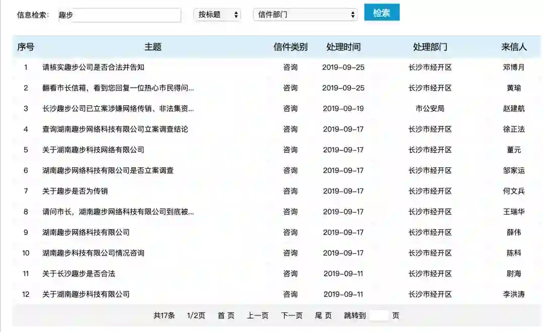 从今年7月2日至今,长沙市人民政府的官方网站上,针对趣步涉嫌违规、传销的问题致信市长信箱的市民问询信共有17封。