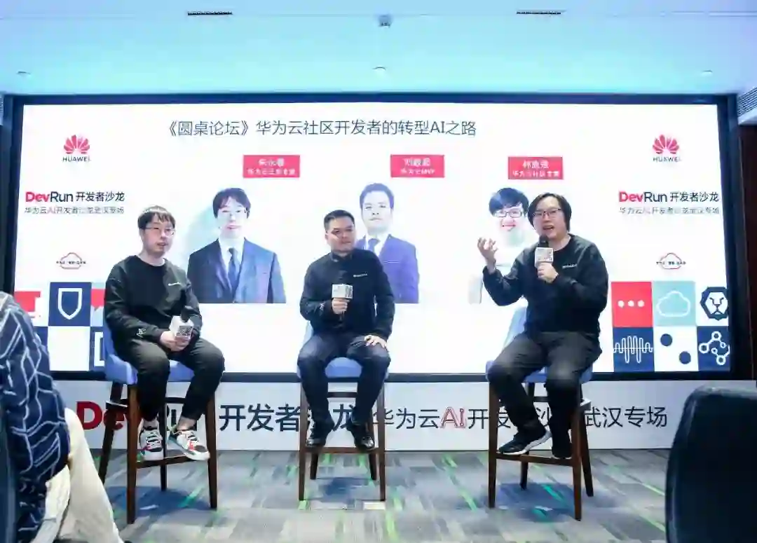 在短暂的茶歇过后,以“华为云社区开发者的转型 AI 之路”为主题的圆桌论坛缓缓拉开序幕。作为为开发者提供友好交流、并提供丰富技术干货的平台,引导开发者与时俱进是华为云开发者社区的初衷。在论坛上华为云 AI 开发者生态专家林旅强老师返场作为论坛主持人,与华为云 MVP 刘毅超及华为云云享专家朱永春展开了访谈。刘毅超从事软件开发,在公司里和团队一起开发各种互联网项目,还在网络上进行 ModelArts 教学;朱永春因武汉樱花视频画得到关注,在大学生活中经常运用到 AI 技术,华为云的发现与邀请则成为朱永春与 ModelArts 结缘的契机。他们一位是拥有十年工业经验的开发者,一位是有志于 AI 开发的大四学生,在华为云的引荐下,两个没有交集的开发者相会在圆桌论坛上,共同交流他们的 ModelArts 应用经历,彼此间都通过华为云 AI 开发者社区这个专业的学习交流平台不断突破自我,为行业献计献策。像他们这样的开发者还有很多,皆在社区中发挥着各自的优势,成为搭建人工智能生态的重要一环。