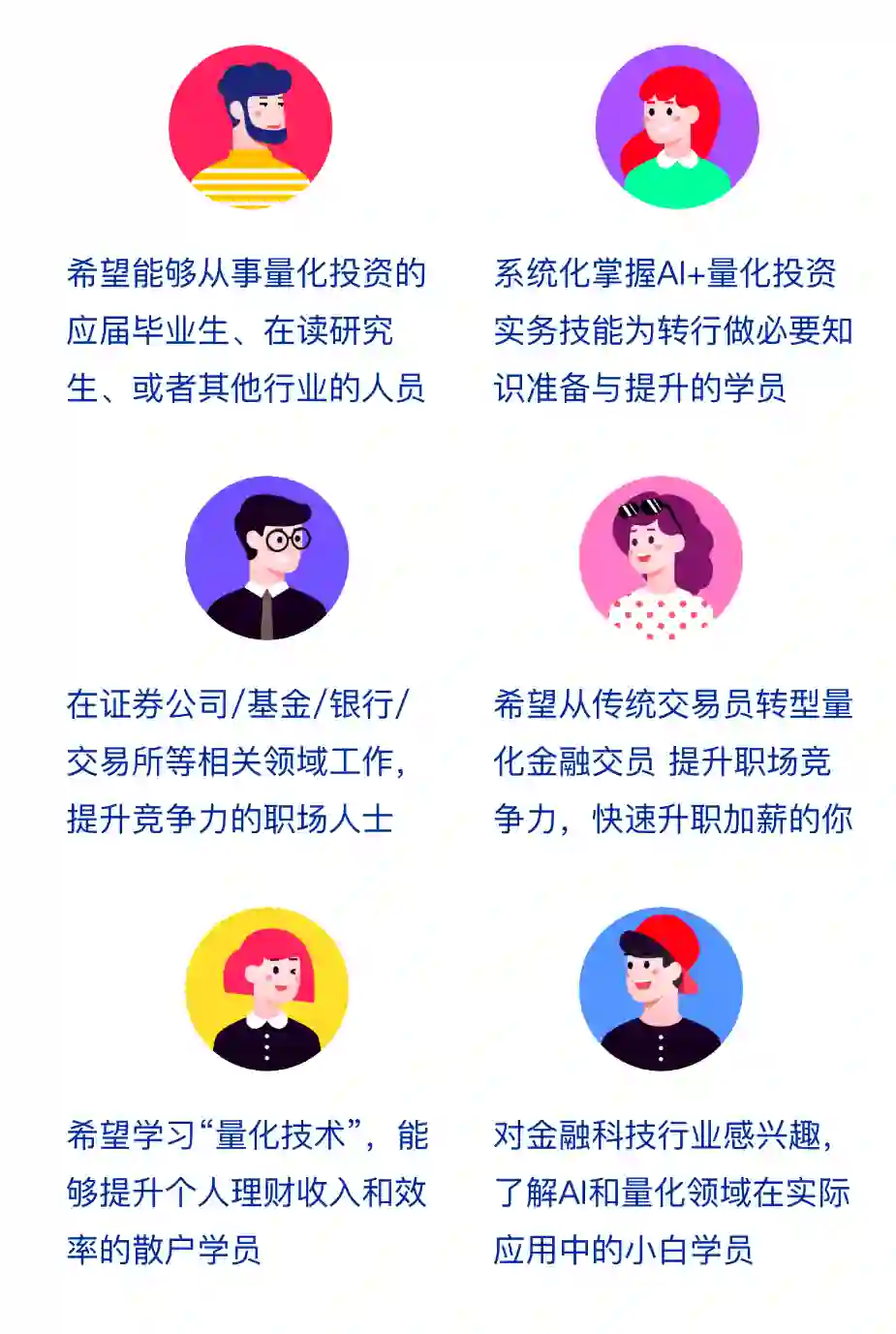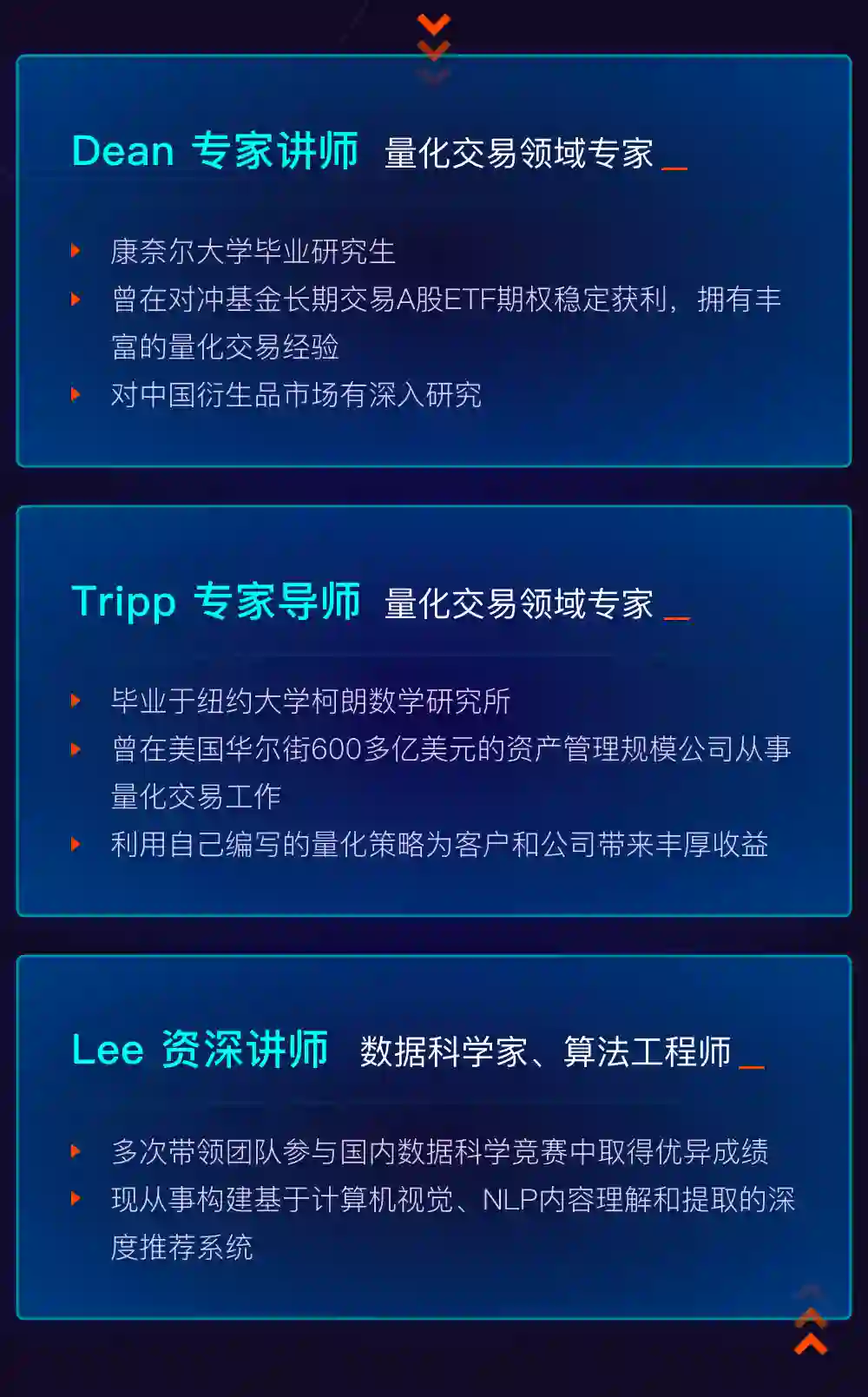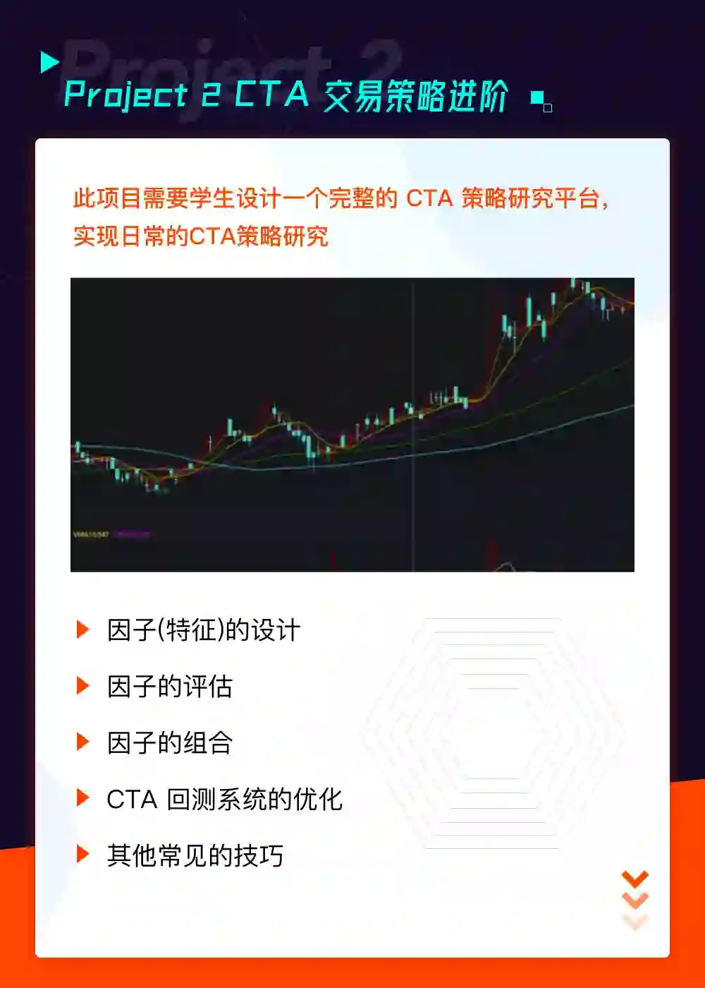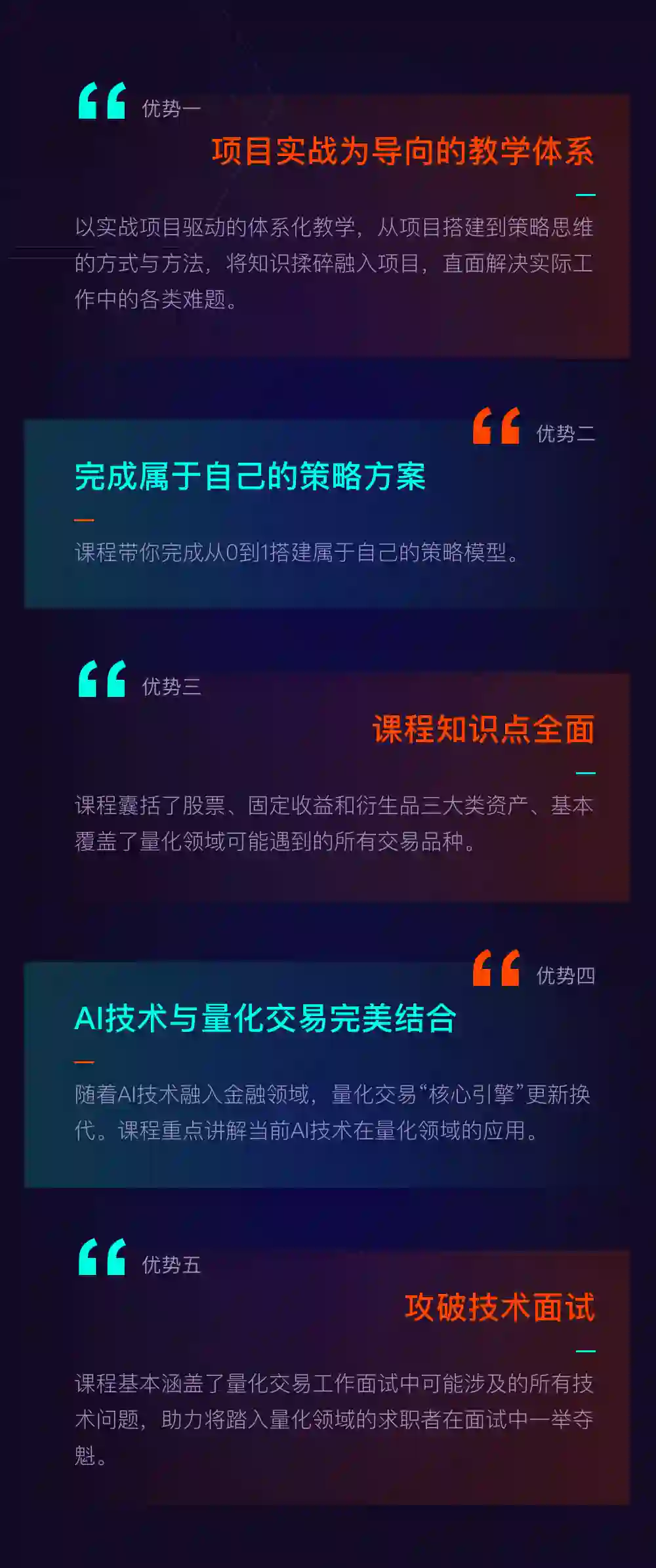课程采用企业级真实项目,每个模块都有企业级别难度的综合项目练习,将知识揉碎融入企业级真实项目中,把 AI 的前沿技术应用到量化领域中。学员通过项目练习,融会贯通量化交易知识,直面实际工作中可能遇到的各类问题并加以解决。