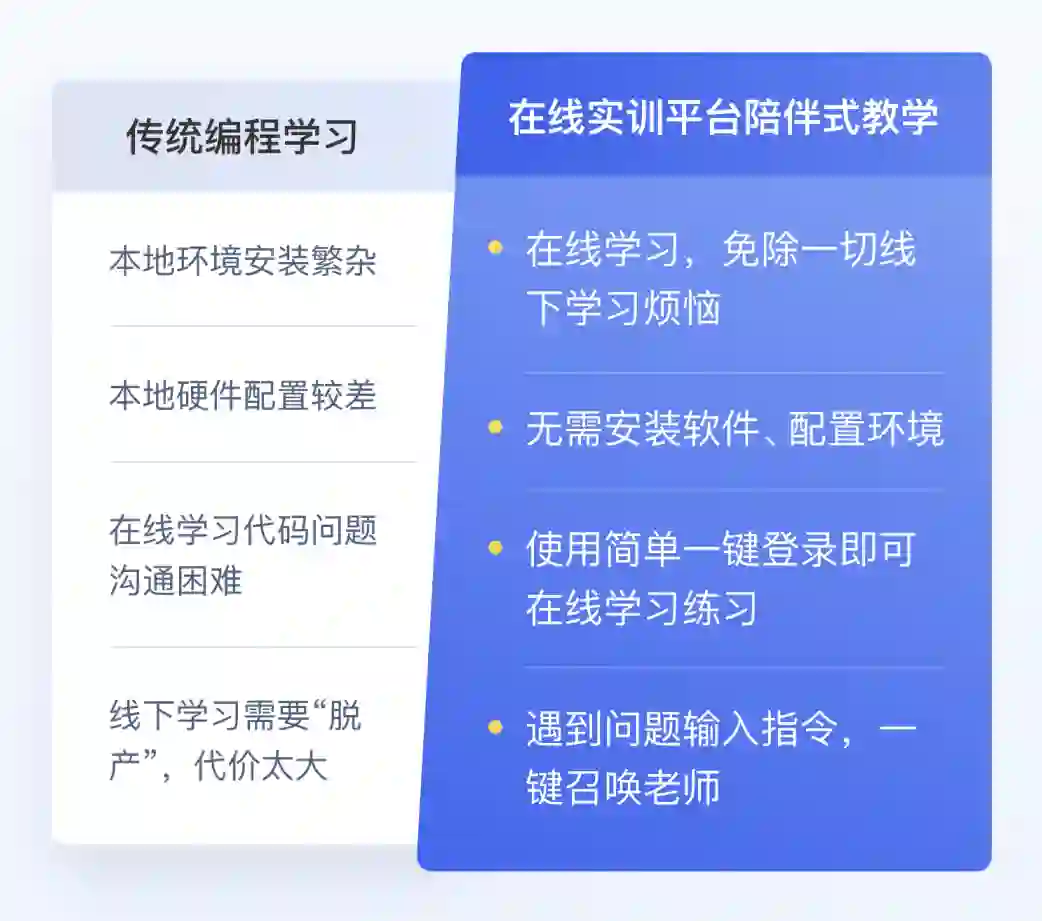 独家自研线上教学环境,免除学员上课前下载步骤,课上无需配置环境,代码驱动,可以实时跟随老师的授课思路。同时能够在线进行编辑运行,随学随用。