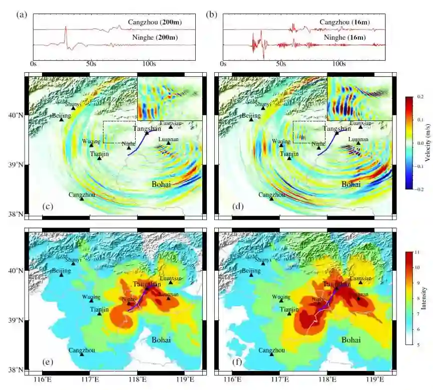 基于神威太湖之光超级计算机的强大计算能力,项目团队成功设计实现了高可扩展性的非线性地震模拟工具。该工具充分发挥国产处理器在存储、计算资源等方面的优势,可以实现高达18.9PFlops的非线性地震模拟,也是国际上首次实现如此大规模下的高分辨率、高频率的非线性可塑性地震模拟。该工具首次实现了对唐山大地震(M7.8, 1976)发生过程的高分辨率精确模拟,使得科学家可以更好地理解唐山大地震所造成的影响,并对未来地震预防预测等研究具有重要的借鉴意义。