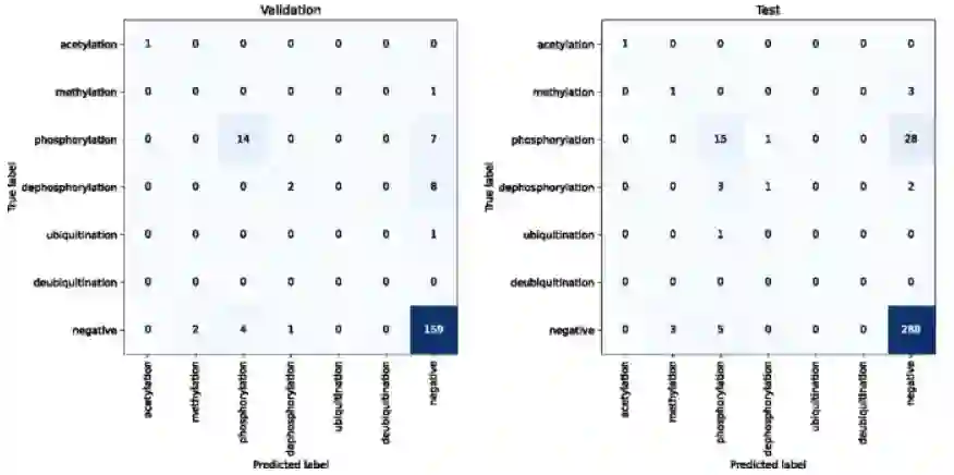 PPI-BioBERT-x10 上测试和验证集的混淆矩阵。