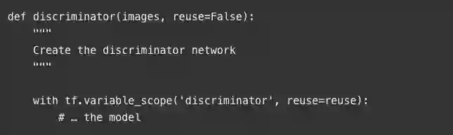 定义这个网络时,我们要使用一个TensorFlow变量作用域。这有助于我们稍后的训练过程,所以我们可以重复使用我们鉴别器和发生器的变量名。