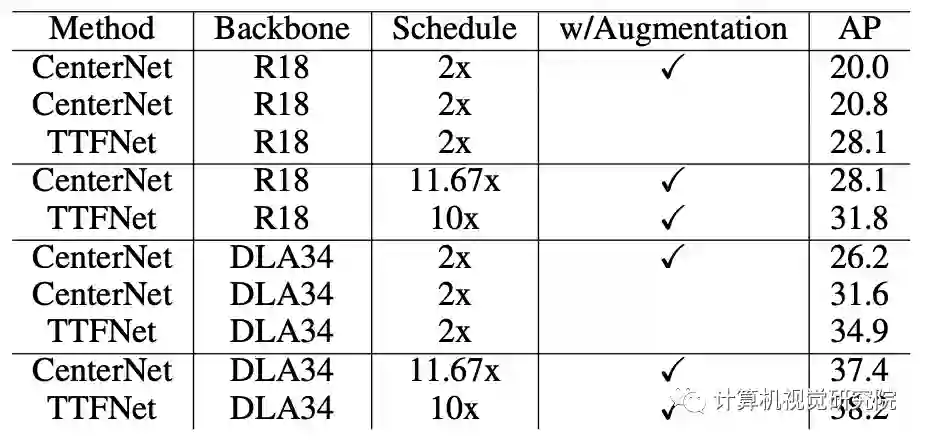 3、在精度方面,实验显示res18下与CenterNet都在COCO上达到了28.1的mAP,但0.5的mAP比CenterNet低了1个点左右,0.75的mAP比CenterNet高了0.6个点,所以猜测TTFNet可能检测出的bbox更加紧凑,因此提高了mAP。