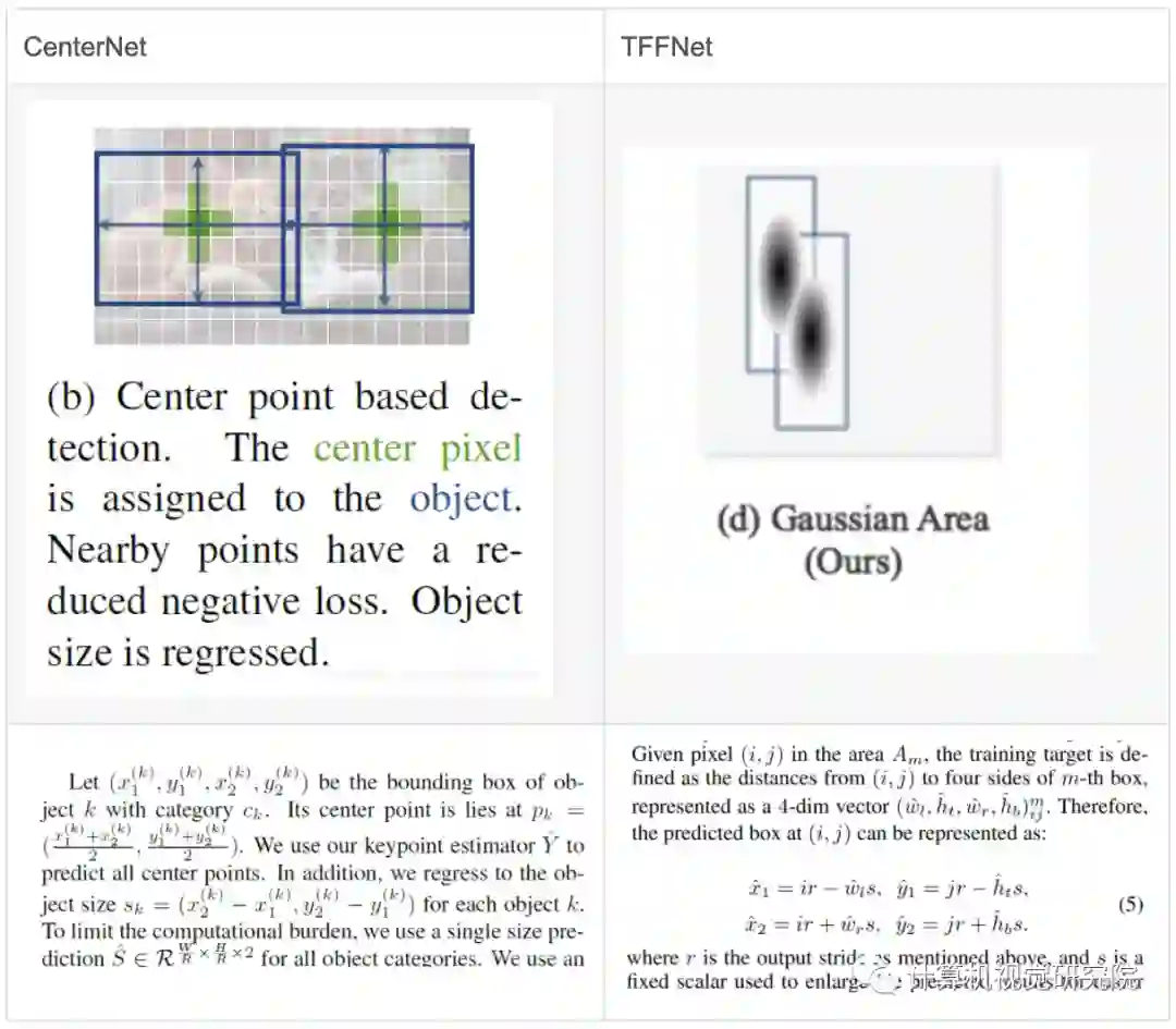 对于Center点的位置回归,两个方法都用到了高斯核来增加正样本的数量,也都用到了Focal Loss。但是CenterNet核CornerNet一样,高斯核里的参数sigema只和bbox的面积有关,没有充分考虑bbox的纵横比,而TFFNet为长和宽分别设置了sigema,从而更加合适。