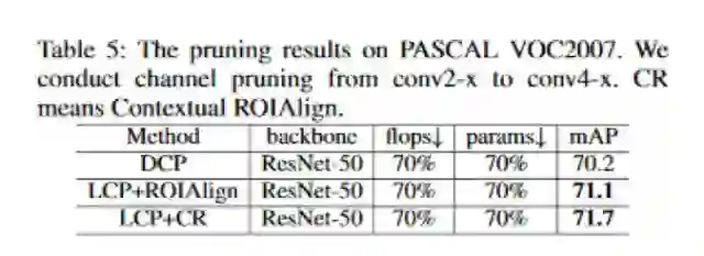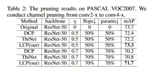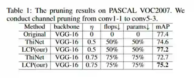 在PASCAL VOC上,本文将VGG-16从conv1-1剪枝到conv5-3,压缩率为0.75,速度快4倍。