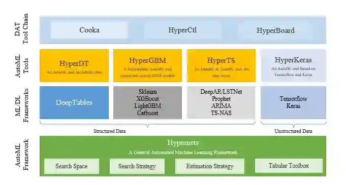DAT 的所有项目都是以开源方式来开发的。(开源地址:https://github.com/DataCanvasIO)。DAT(DataCanvas AutoML Toolkit)是一个自动机器学习工具套件包,它包含了首个 AutoML 开源架构 Hypernets 和一系列功能强大的 AutoML 开源工具,从底层的通用自动机器学习框架到用于结构化及非结构化领域端到端的自动建模工具。DAT 包含 DeepTables、Hypernets、HyperGBM、HyperTS、 Cooka、HyperBoard 、HyperCtl。DAT 性能突破了机器学习建模过程中存在的不均衡、概念漂移、泛化能力、大规模数据 4 大难点。
