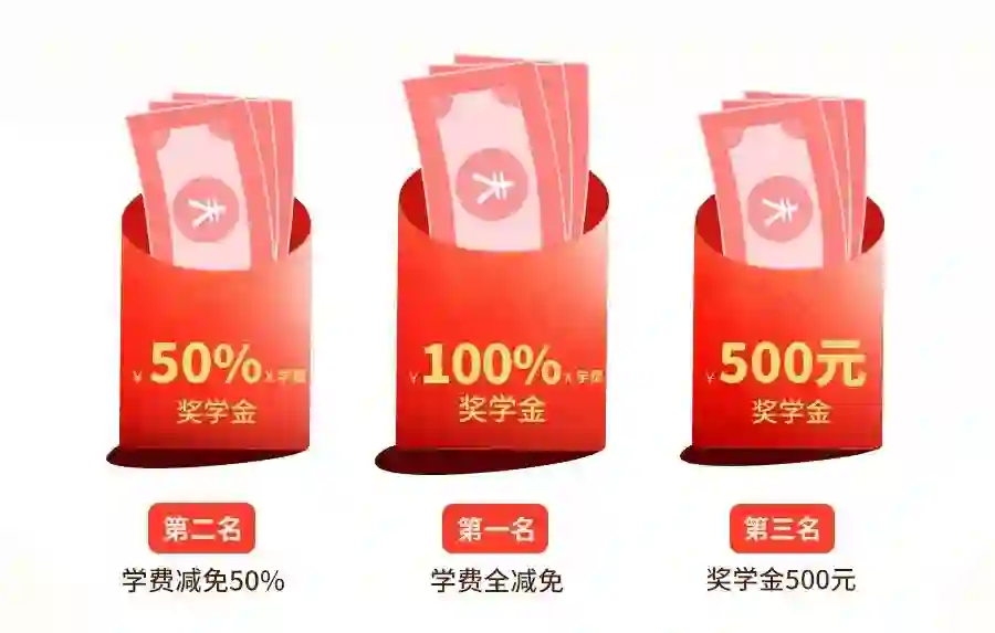 优秀学员奖励:在课程结束时,我们会以本学期总成绩为准,给前三名同学颁发奖学金,第三名获得500元,第二名学费减免50%,第一名学费全减免!