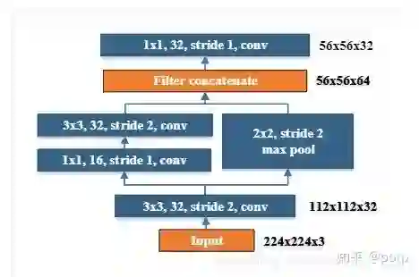 仔细看看上图展示的结构,先使用strided 3x3卷积进行快速降维,然后用了两分支的结构,一个分支用strided 3x3卷积, 另一个分支使用了一个maxpool。
