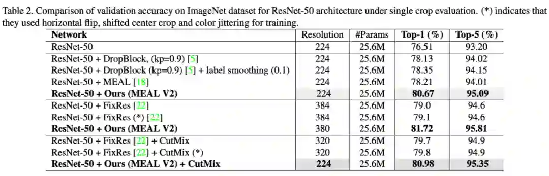 同时我们也不得不反思一下,是否一些新设计的网络结构真的有那么大的进步和贡献,毕竟从 MEAL V2 的实验结果来看,到目前为止原生的 ResNet-50 的性能都还没有完全饱和,这也促使我们更理性、客观的去评价其他一些看上去性能很好的模型结构。