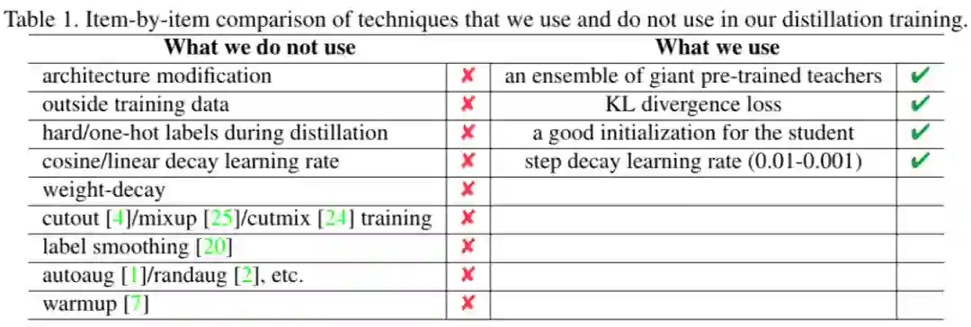 通常我们在训练网络的时候会用到很多技巧(tricks),但是在 MEAL V2 中,这些都是不需要的,作者罗列了他们使用到的和未使用到的一些训练手段,如下表格所示: