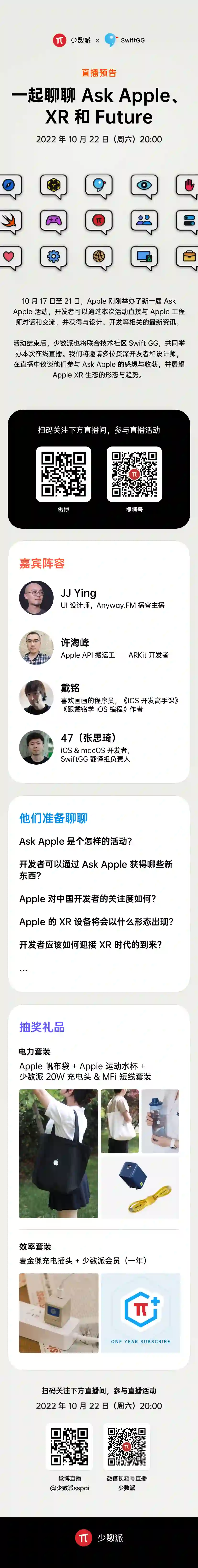 在活动结束后,少数派也将联合国内知名的技术社区 Swift GG,共同举办《和我们一起畅想 Apple 的 AR 与 VR》在线直播。我们将邀请多位资深开发者和设计师,在直播中谈谈他们参与 Ask Apple 的感想与收获,并展望 Apple XR 生态的形态与趋势。