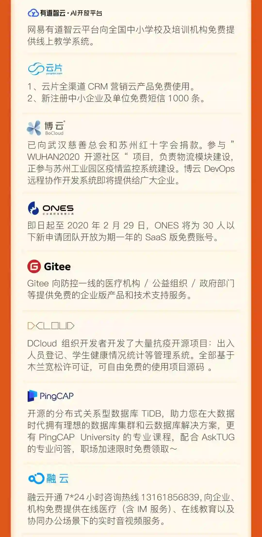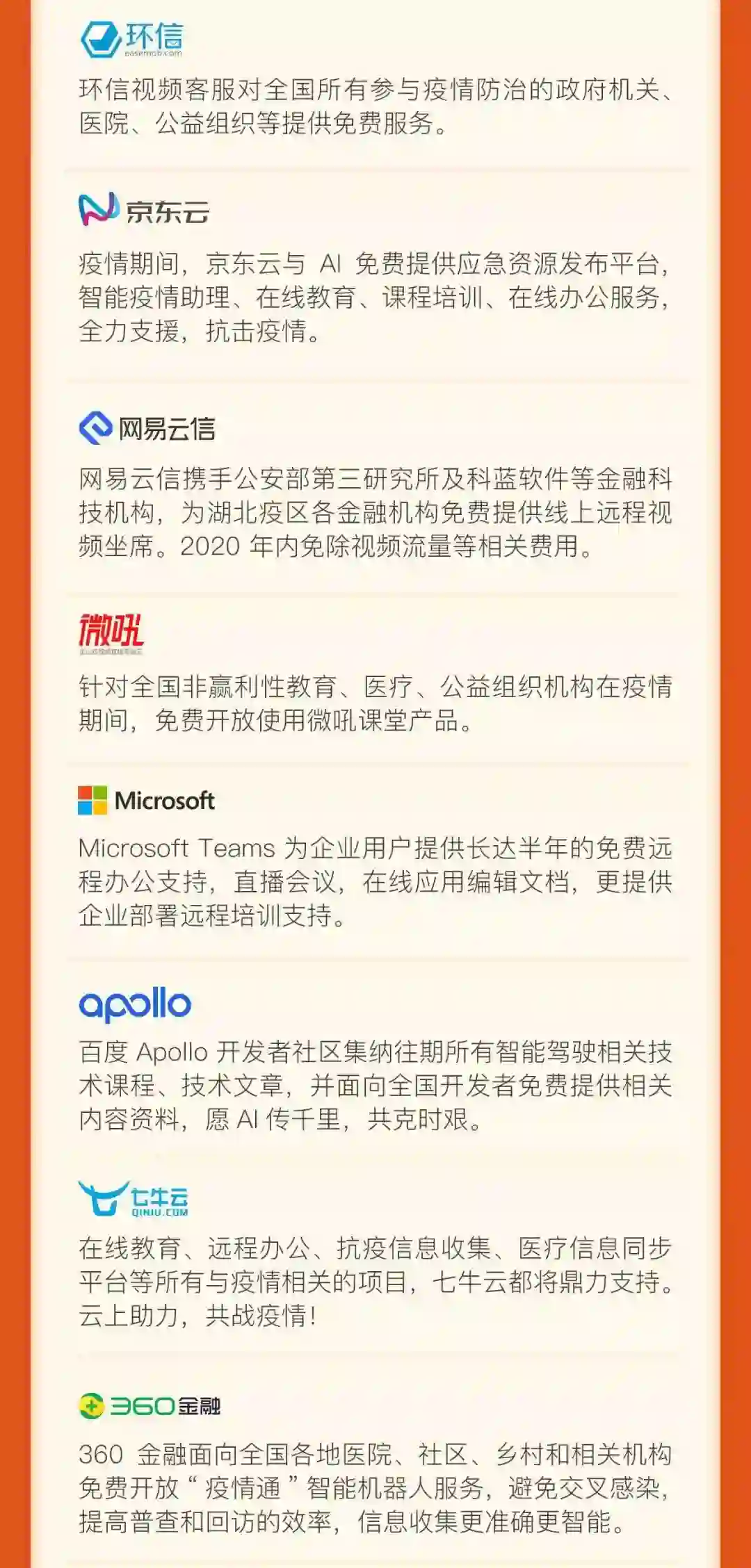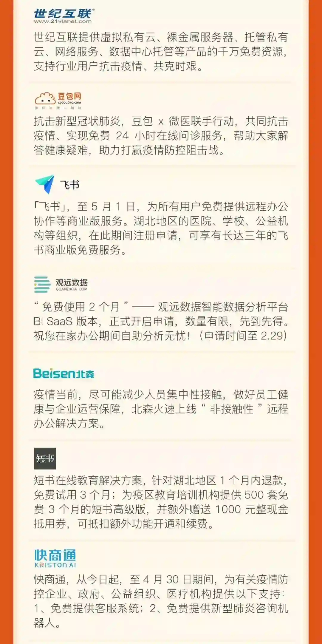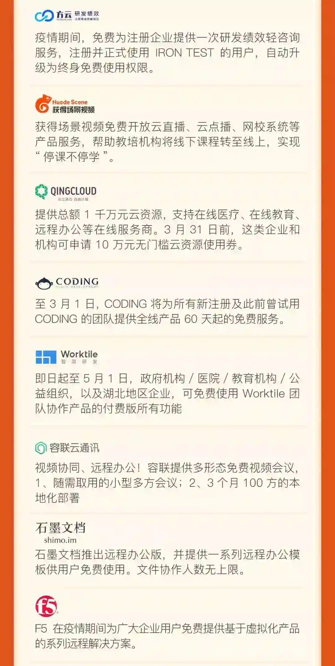 远程办公类:服务于有远程办公需求的企业和政府机构,包括免费的协同办公产品、在线办公服务、远程视频服务、直播会议服务、云计算资源等;