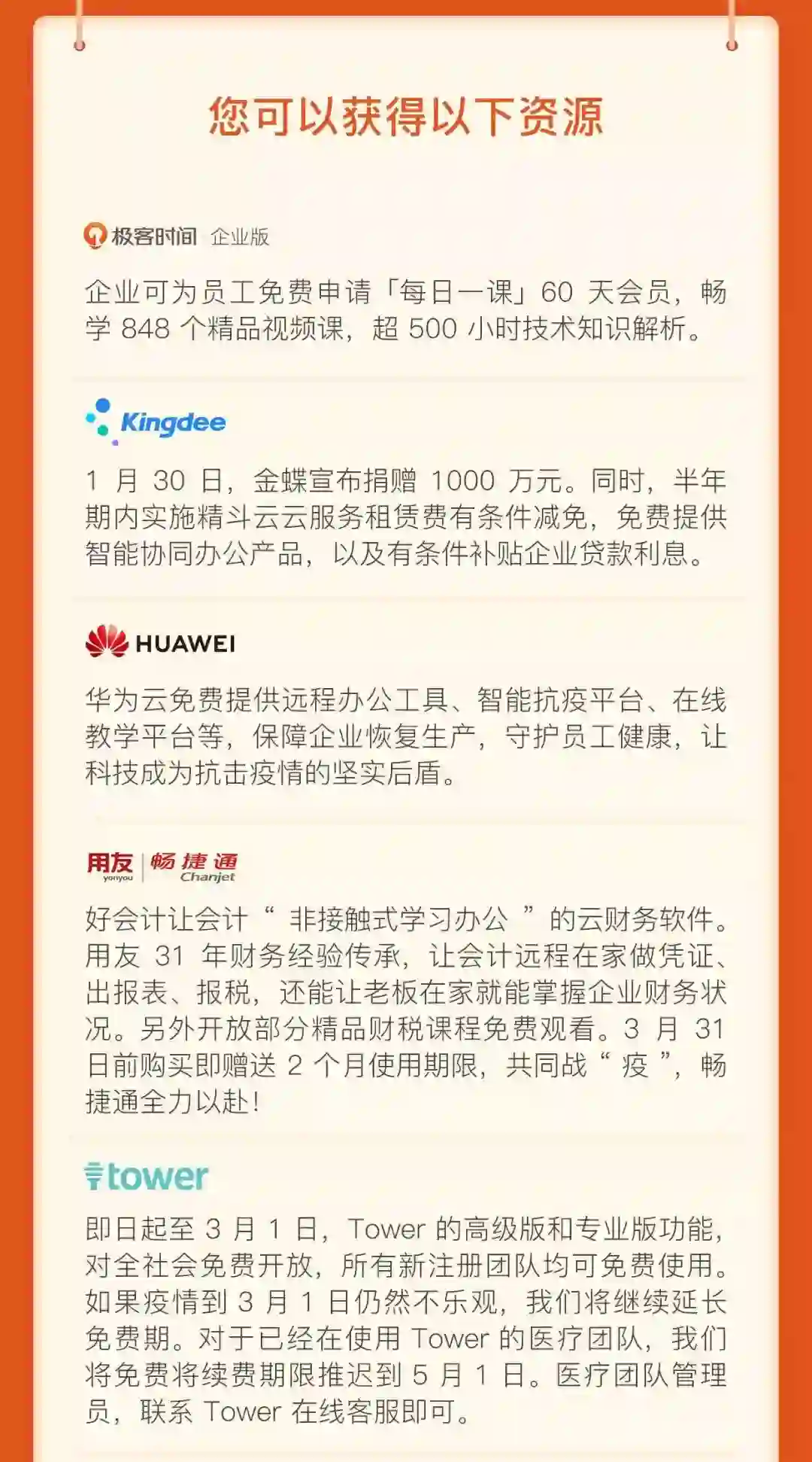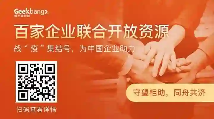 极客邦科技为此特别联合百家企业共同发起“抗击疫情企业联合行动”,向社会各界有 ToB 业务扶持、远程办公、在线医疗、在线教育等需求的企业和个人,提供工具类、平台类、产品类、资源类、知识服务类公益支持。让我们众志成城,共渡难关。
