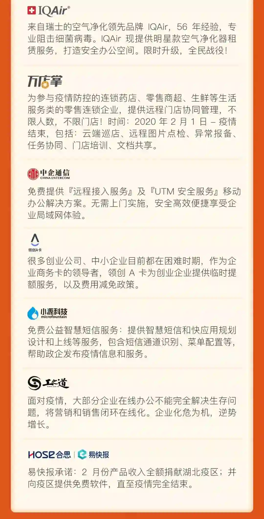 最后,再次感谢所有参与本次抗击疫情联合行动的企业,也感谢那些默默付出并未留下姓名的所有企业。让我们携起手来,在渡过此次困难和挑战的同时,承担企业社会责任,传递正能量。为中国企业助力,为疫情期间经济建设助力!
