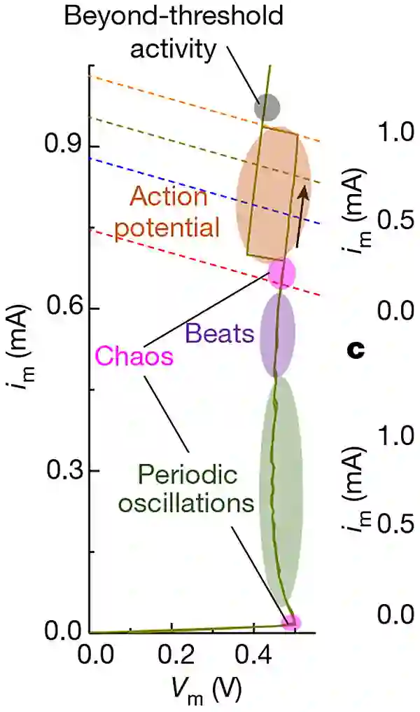 这并非不可能,近日,惠普实验室的 Suhas Kumar、R.Stanley Williams(现在为德州农工大学教授)以及斯坦福大学已故博士生 Ziwen Wang 发明了一种满足这些要求的设备。只需使用简单的直流电输入,这一设备不仅可以输出其他设备可以管理的简单脉冲,而且还可输出神经元的全部活动情况,包括脉冲爆发、自激振荡,以及大脑中出现的其他情况。