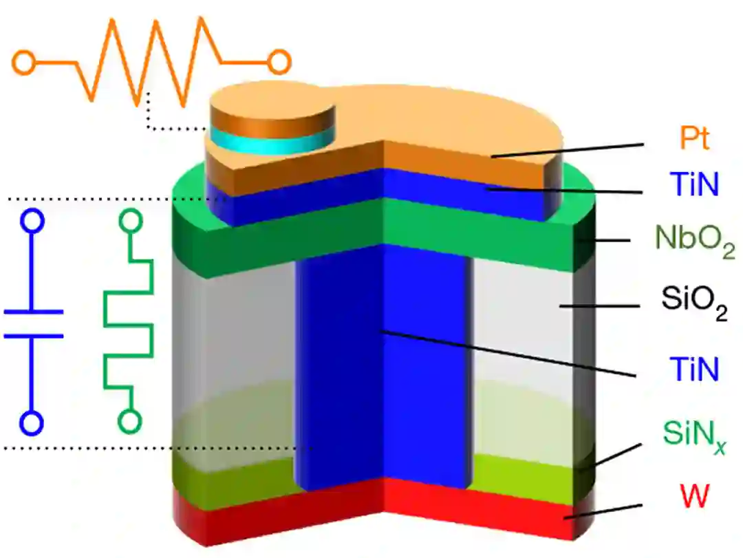 新器件结合了电阻、电容和 Mott 忆阻。最关键的部分是纳米级薄度的 NbO2 层。