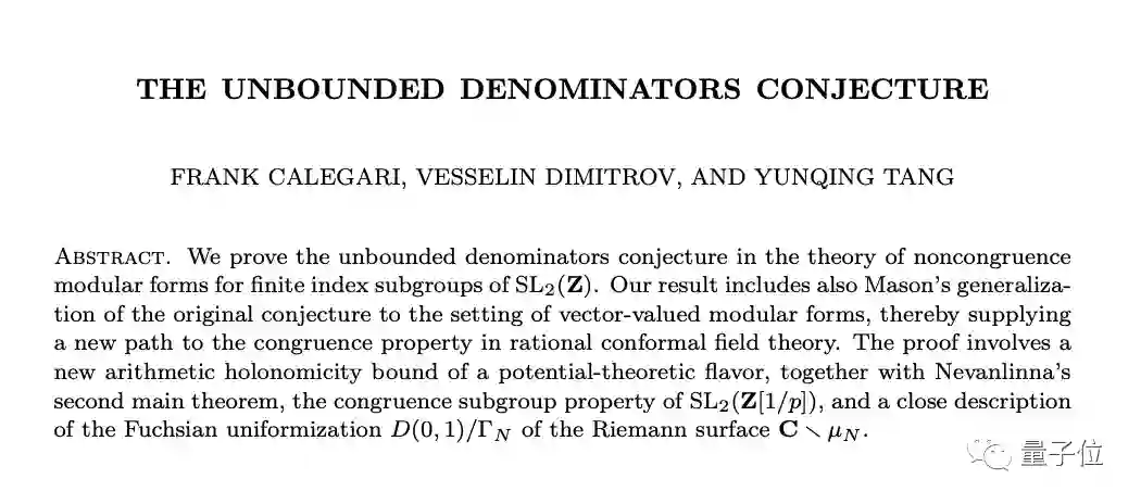 最新相关以及最具代表性的工作,就是今年同合著者一起成功证明了非同余子群无界分母猜想。
