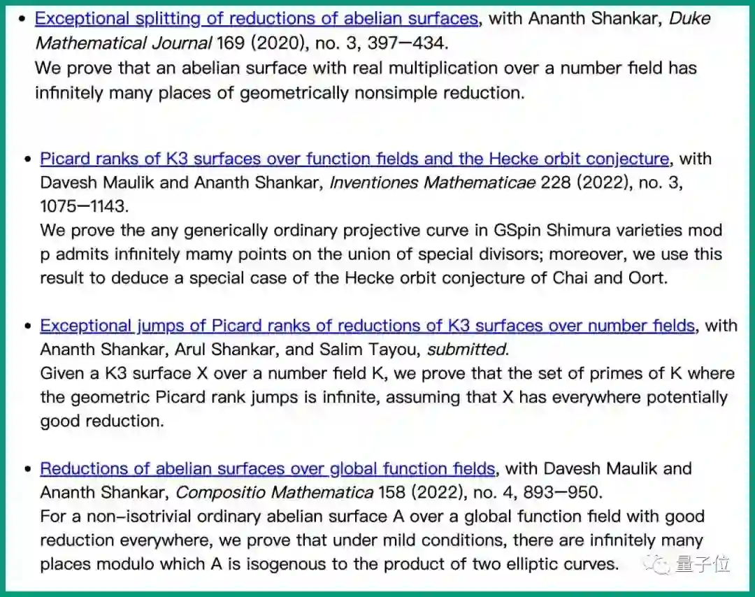 分别是2020年证明了任何具有实数乘法的非线性曲面具有无限多的几何非简单还原位置;2022年又在函数场环境中建立了类似的结果。而在最近两篇工作中,唐云清又在K3曲面的设定中证明了类似的定理。