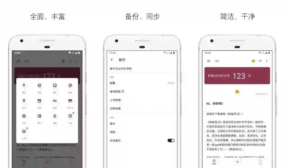 麻雀笔记是一个很简洁的笔记APP,但是它的功能确实很全面,你可以使用它添加笔记 / 便签 / 清单 / 绘画 / 地址 / 名片 / 通知等等。你没有看错使用它可以记录生活的点点滴滴。
