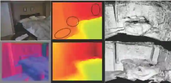 本文提出了一个使用移动单目相机进行稠密3D场景重建的高效的框架。完全基于几何方法的vSLAM已经被证明能够准确地跟踪移动摄像机的位姿并同时实时地构建环境地图。然而,大多数算法建成的3D地图太稀疏,无法实际应用。生成的地图中的缺失点主要对应于输入图像中缺少纹理的区域,而稠密的建图系统通常依赖于手工制作的先验特征,如分段平面性或分段平滑的深度。这些先验并不总能提供足够的场景理解来准确填充地图。另一方面,卷积神经网络(CNN)在从图像中提取高层次的信息和递归像素的表面法线、语义甚至深度方面取得了巨大的成功。在这项工作中,作者利用到了深层CNN以表面法线先验形式学习到的高层次的场景上下文信息。作者指特别出,使用表面法线先验比更弱的平滑先验可以有更好的重建效果。