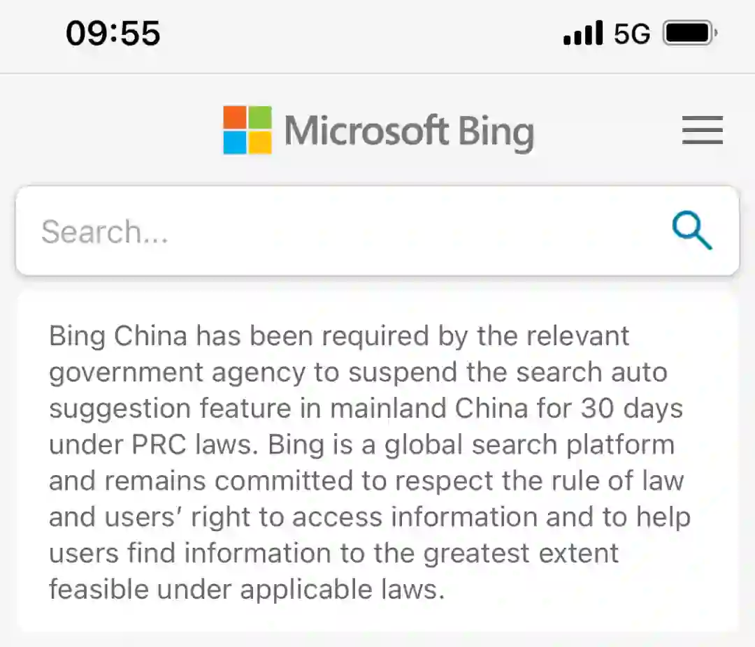 声明称,根据中华人民共和国的相关法律,必应中国将在中国大陆地区暂停搜索自动建议功能30天。