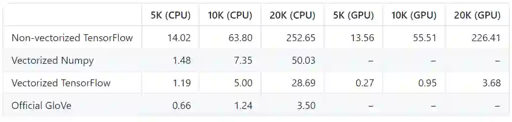 我们使用大约 90% 稀疏的随机生成的共现矩阵来比较各种词汇每个时期速度(以秒为单位)。正如我们在这里看到的,在 GPU上 运行时,其性能与官方用 C 语言实现的版本(https://github.com/stanfordnlp/GloVe)相比具有竞争力。