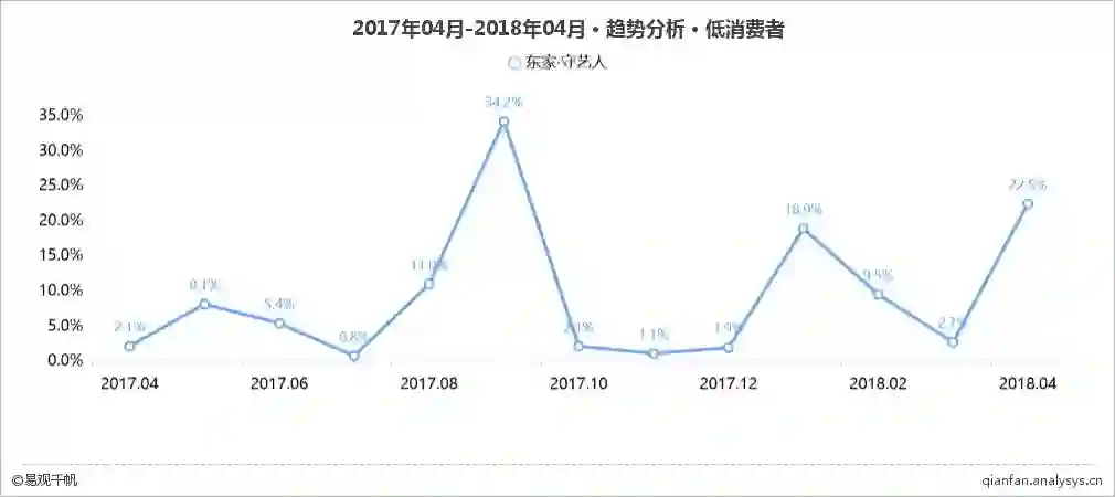 有意思的是,从消费能力分布来看,东家APP低消费者用户比例虽然波动较大,但总体上仍占一定地位;中低和中等消费者也较多。综合用户画像来看,表面上比较小众冷门的东家APP,实际受到了各个年龄段不同消费能力人群的关注。由此可见,在传统文化和匠人精神这些日渐主流的情怀感召之下,大众对文化艺术品的审美需求普遍提升,对大隐隐于市的匠人们的关注度也明显增长。在这一背景下,东家APP提出要打造文化生活平台,在做电商之外,用有质感、有格调的专业东方美学内容吸引了各种类型的用户,为自身持续增长储备了潜在市场。