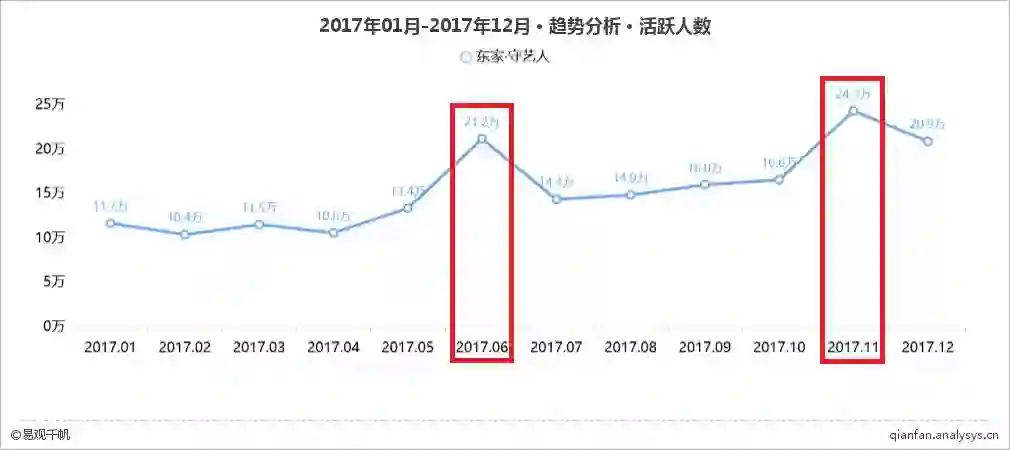 2017年6月,东家推出声势浩大的逛窑活动,汇集亚洲20个知名窑口,100多位优秀匠人,匠心造瓷、一起淘器。易观千帆数据监测显示,当月APP活跃人数跃升至21.2万,环比增幅58.5%。