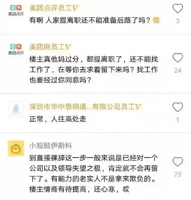 还有网友认为:从成本的角度上来看,加钱或许还有挽留的机会!但是还有网友剖析得比较全面:程序员的工作本来就忙,甚至不惜天天加班到深夜!而他对公司是有多失望才会在上班时间看招聘?而且作为领导竟然不知道为员工某福利就算了,竟然还以局外人的心态对他表示心寒?可能员工对你早就寒心了!