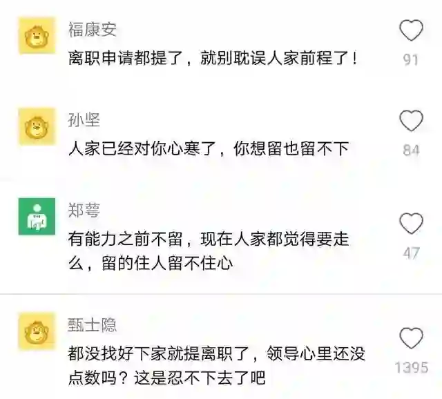 有网友疑问:既然知道他有能力,为什么在离职之前不留下他?现在人家走的时候觉得要留下,没用!之前留住的是心,现在可能连人都留不住,真能留下就是耽误了他的前程!