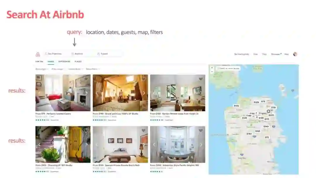 Airbnb 作为全世界最大的短租网站,提供了一个连接房主(host)挂出的短租房(listing)和主要是以旅游为目的的租客(guest/user)的中介平台。这样一个中介平台的交互方式比较简单,guest 输入地点,价位,关键词等等,Airbnb 会给出 listing 的搜索推荐列表: