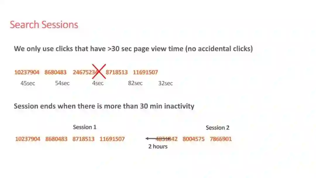 Airbnb 采用了 click session 数据对 listing 进行 embedding,其中 click session 指的是一个用户在一次搜索过程中,点击的 listing 的序列,这个序列需要满足两个条件,一个是只有停留时间超过 30s 的 listing page 才被算作序列中的一个数据点,二是如果用户超过 30 分钟没有动作,那么这个序列会断掉,不再是一个序列。