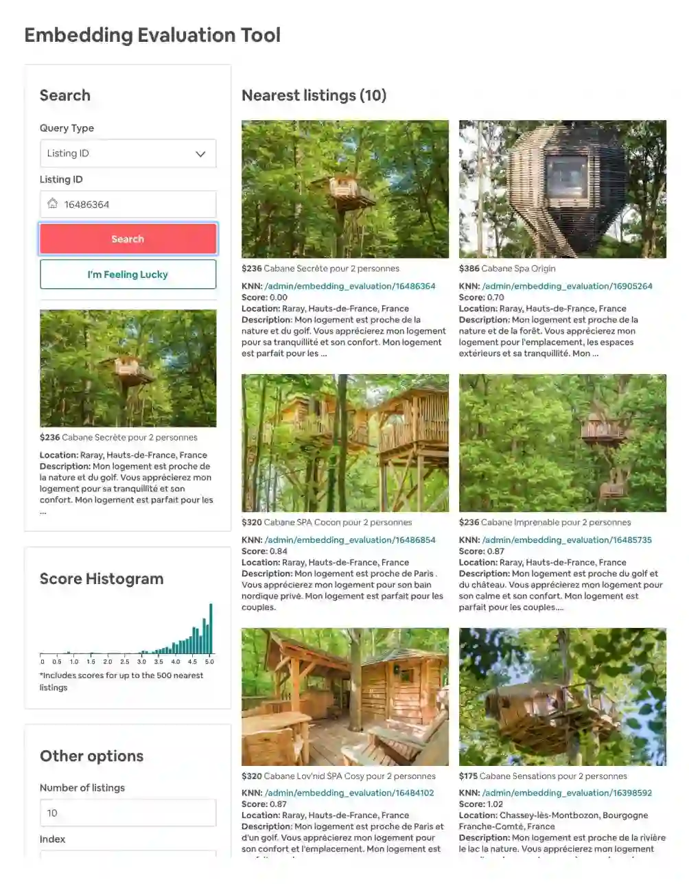为了对 embedding 的效果进行检验,Airbnb 还实现了一个 tool,我们简单贴一个相似 embedding listing 的结果。