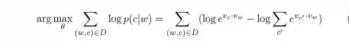 我们假设大家已经具备了基本知识,这里直接列出 word2vec 的 skip-gram model 的 objective 如下: