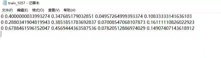 打开具体的标注文件,你将会看到下面的内容,txt文件中每一行表示一个目标,以空格进行区分,分别表示目标的类别id,归一化处理之后的中心点x坐标、y坐标、目标框的w和h。
