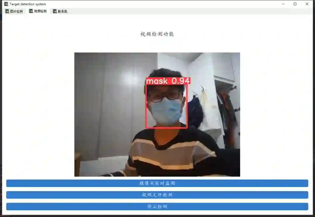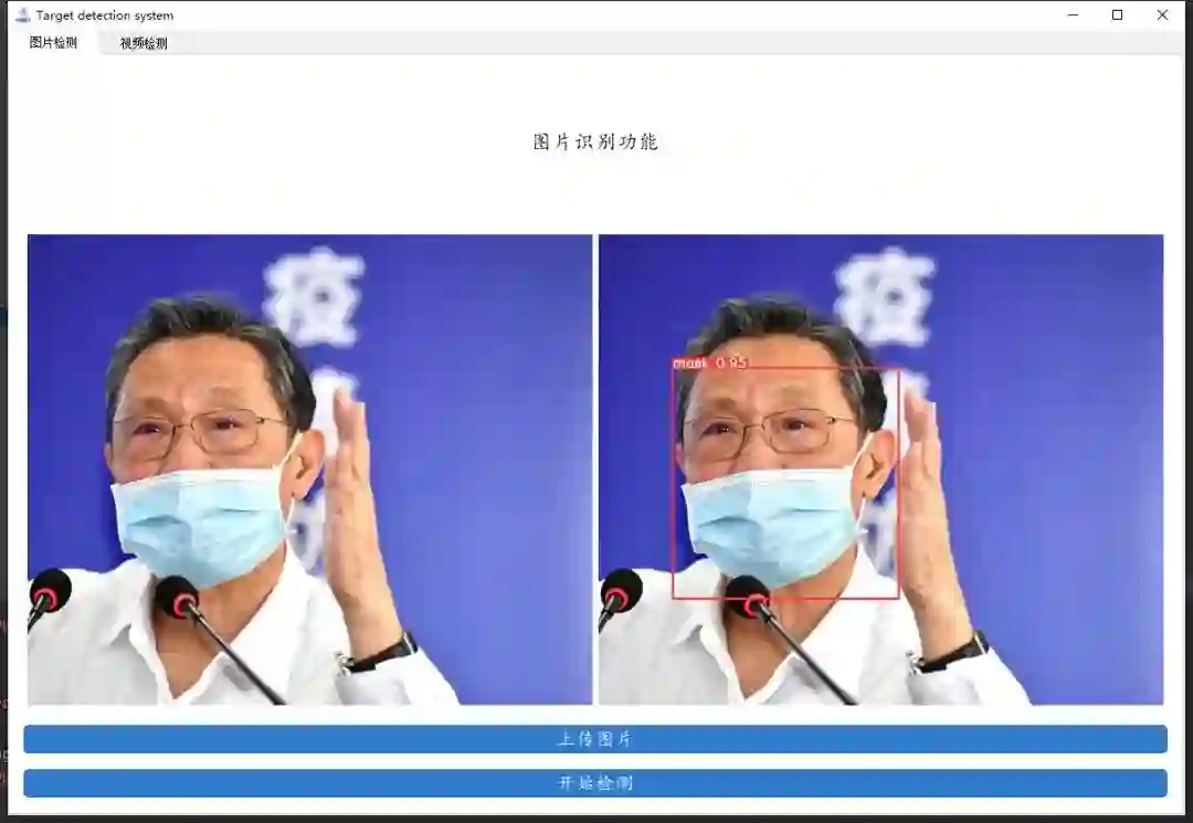 先来看看我们要实现的效果,我们将会通过数据来训练一个口罩检测的模型,并用pyqt5进行封装,实现图片口罩检测、视频口罩检测和摄像头实时口罩检测的功能。