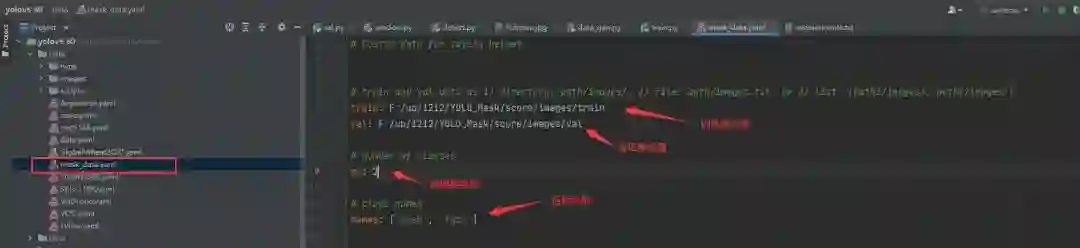 这里的配置文件是为了方便我们后期训练使用,我们需要在data目录下创建一个mask_data.yaml的文件,如下图所示: