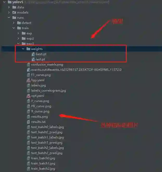 在train/runs/exp3的目录下可以找到训练得到的模型和日志文件