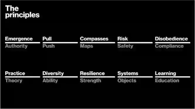 然而,伊藤穰一更像是一个社会实践者。他总结了9大原则:涌现优于权威、拉力优于推力、指南针优于地图、风险优于安全、违抗优于服从、实践优于理论、多样性优于能力、韧性优于力量以及系统优于个体。