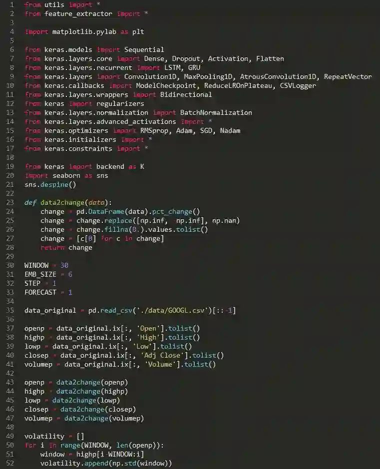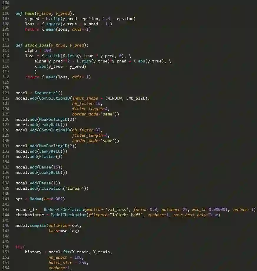 我们可以看到,如果我们正确地预测方向(信号),那就是同样的平均绝对误差(K.abs(y_true-y_pred)),但如果不是,对错误的信号我们会惩罚我们的亏损(alpha * y_pred **2-K.sign(y_true)* y_pred +K.abs(y_true))参数a被需要用来控制惩罚量。为了将这个损失函数应用到我们的模型中,我们需要用它(参数a)去简单地编译模型。