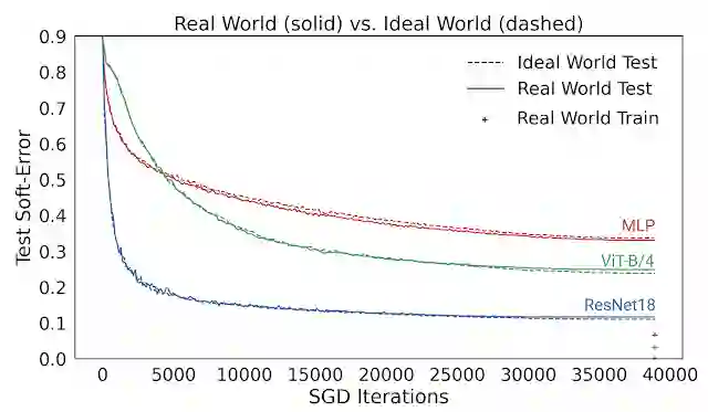 我们从中得出一个重要的观察结果,即直到现实情况开始收敛前,现实情况和理想情况下的模型在所有时刻的测试误差都非常接近(训练误差 < 1%)。因此,我们可以通过研究模型在理想情况下的行为来理解它们在现实情况下的表现。