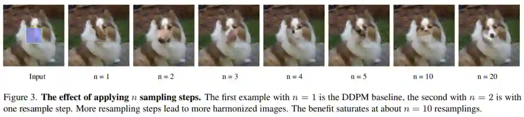 当直接应用上述方法时,研究者观察到:只有内容类型(content type)与已知区域匹配。比如,在下图 3 中,当 n 为 1 时,图像修复的区域是与原始输入图像狗狗的皮毛相匹配的皮毛纹理。尽管图像修复的区域与邻近区域的纹理相匹配,但在语义上显然是不正确的。因此,虽然 DDPM 利用了已知区域的上下文,但它并没有很好地协调图像的其他部分。