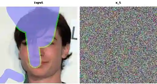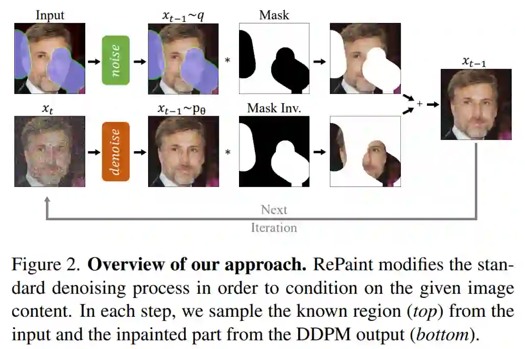 它的修复效果是这样的,RePaint 使用扩散模型填充缺失的图像部分:下面示例中,蓝色部分是图像缺失部分,也就是需要 RePaint 修复的部分,RePaint 会根据已知的部分生成缺失的部分。它的修复过程是这样的:首先从纯粹的噪音开始,然后对图像逐级降噪,中间的每一步使用图像已知部分来填充未知部分。