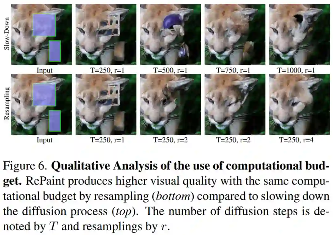 为了分析增加的计算预算是否会提高重采样性能,该研究将其与第 4.2 节中描述的缓慢扩散过程中常用技术进行了比较。图 6 和表 2 中展示了对每个设置使用相同计算预算的重采样和缓慢扩散。该研究观察到重采样使用额外的计算预算来协调图像,而在缓慢扩散过程方面没有明显的改进。